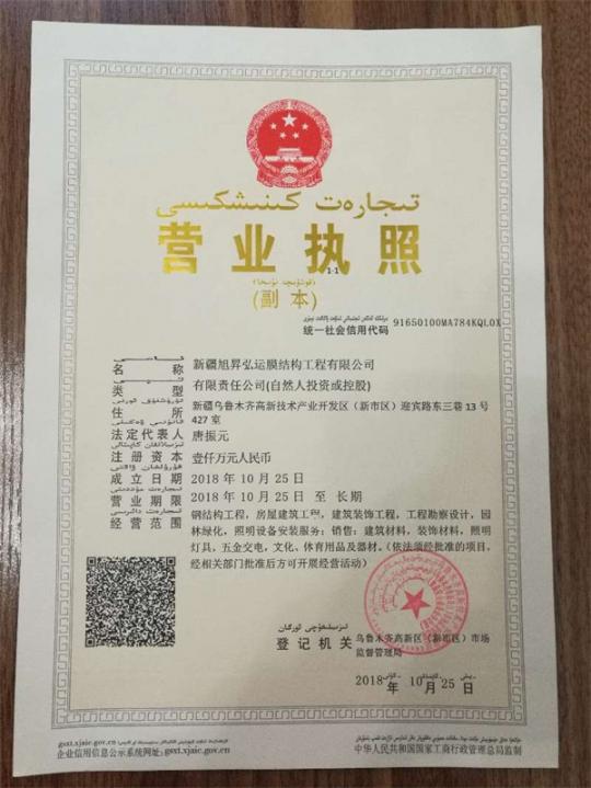 公司名称:新疆旭昇弘运膜结构工程有限公司